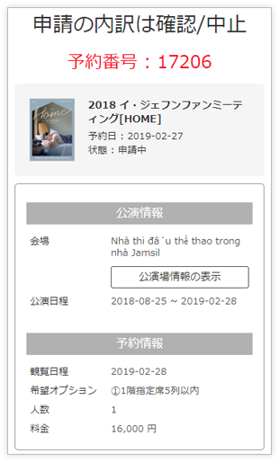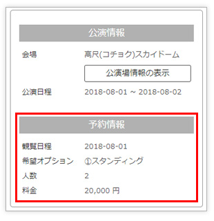 予約詳細ページ 予約に関する基本情報を確認可能!(予約状況、予約番号、予約人数、公演日程)