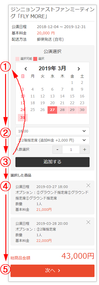 ④ 2公演希望の場合、(①)から再度選択後、追加予約